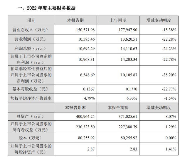 1月12日,天威視訊披露了2022年度業(yè)績快報(bào),其中顯示,2022年度實(shí)現(xiàn)營業(yè)收入15.06億元,較上年同期減少15.38%;實(shí)現(xiàn)營業(yè)利潤1.06億元,同比下降22.28%;實(shí)現(xiàn)歸屬于上市公司股東的凈利潤1.10億元,同比下降22.78%。