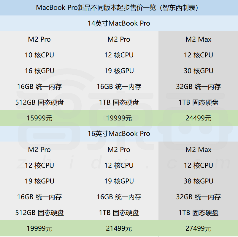 至于大家頗為關注的價格,智東西已經(jīng)為你整理好了一份表格,14英寸MacBook Pro和16英寸MacBook Pro的起售價格分別為15999元和19999元,今年新品的國行售價有小幅上漲,但幅度不大。