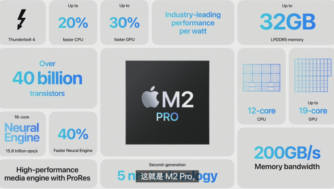 M2 Pro的內(nèi)存帶寬為200GB/s,是M2的兩倍,但與M1 Pro相同,其支持最高32GB的內(nèi)存容量。