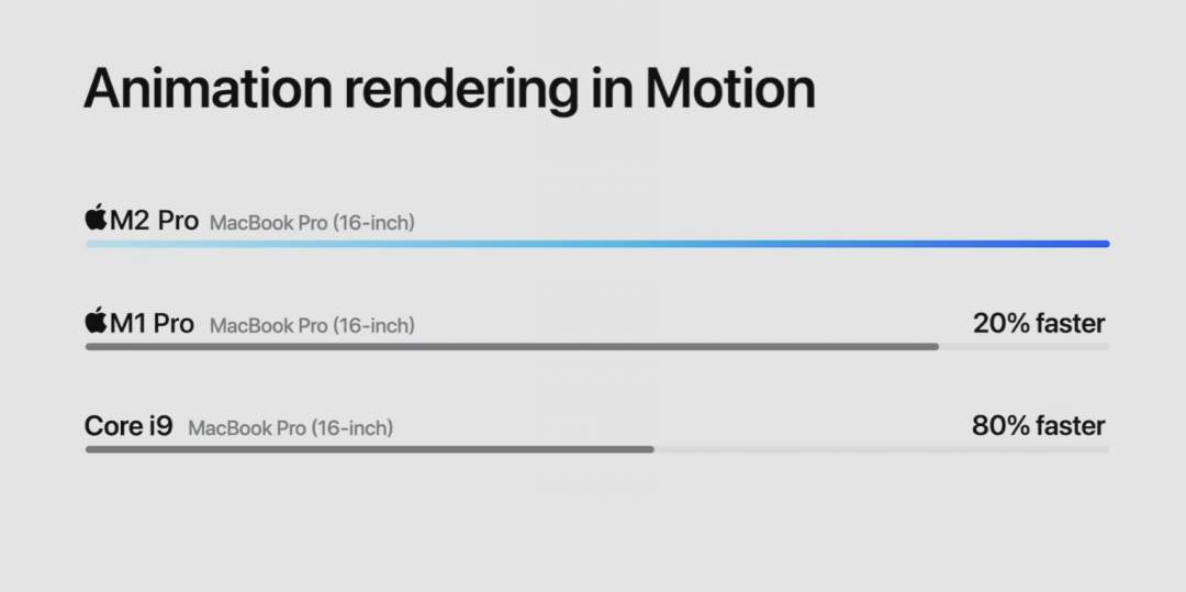 聊到MacBook Pro系列新品時,蘋果這次上來就直接亮出了性能提升對比圖,M2 Pro版16英寸MacBook Pro在Motion應用中進行動畫渲染時,速度相比M1 Pro機型快了20%,相比英特爾酷睿i9機型則快了80%。