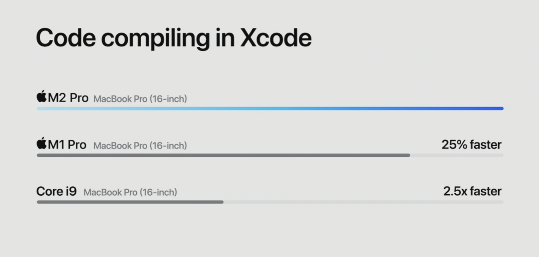用Xcode編譯代碼時,M2 Pro版16英寸MacBook Pro相比M1 Pro機型速度提升了25%,相比英特爾酷睿i9機型則直接快了1.5倍。