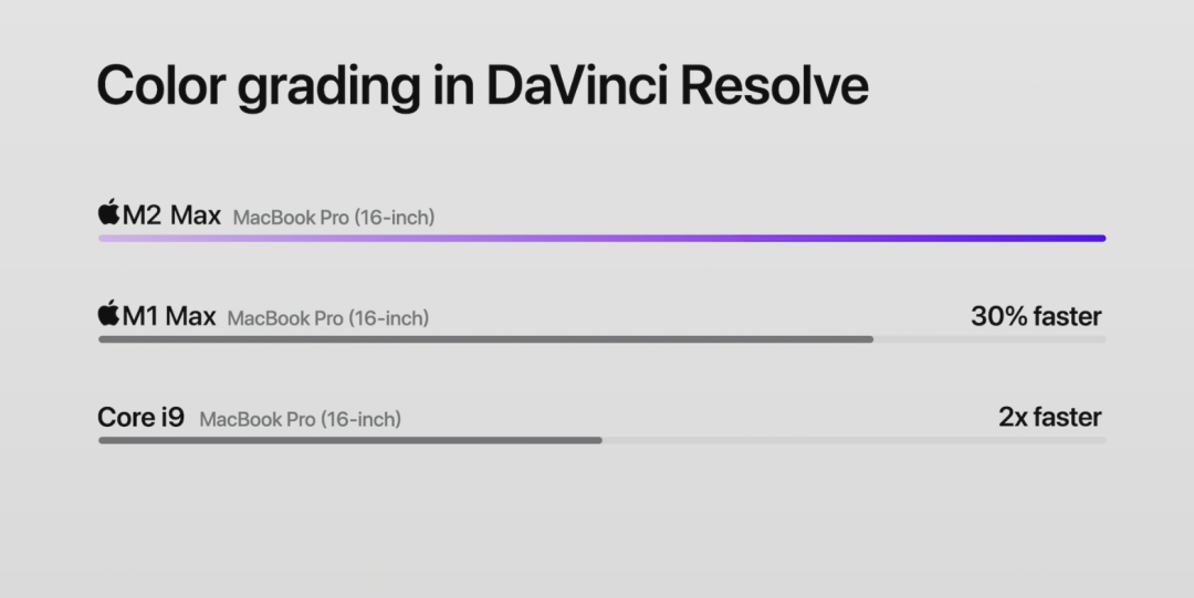 至于搭載M2 Max的16英寸MacBook Pro,蘋果稱其能讓調(diào)色師用達芬奇軟件給8K視頻調(diào)色,速度相比上代M1 Max機型最高提升了30%,相比英特爾酷睿i9機型直接速度翻倍。