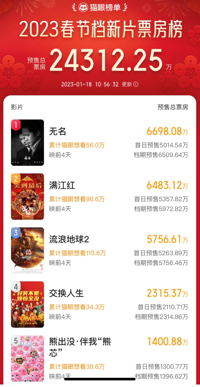 硬糖君原本以為,這不是板上釘釘?shù)摹读骼说厍?》領(lǐng)跑“一超多強(qiáng)”格局嗎。結(jié)果預(yù)售一開,對(duì)不起,是我不懂春節(jié)檔了。宣發(fā)數(shù)據(jù)與聲量靠后的《無名》強(qiáng)勢(shì)領(lǐng)跑,超級(jí)巨頭《流浪地球2》預(yù)售被甩在第三名,甚至落后于第二名的《滿江紅》一大截。