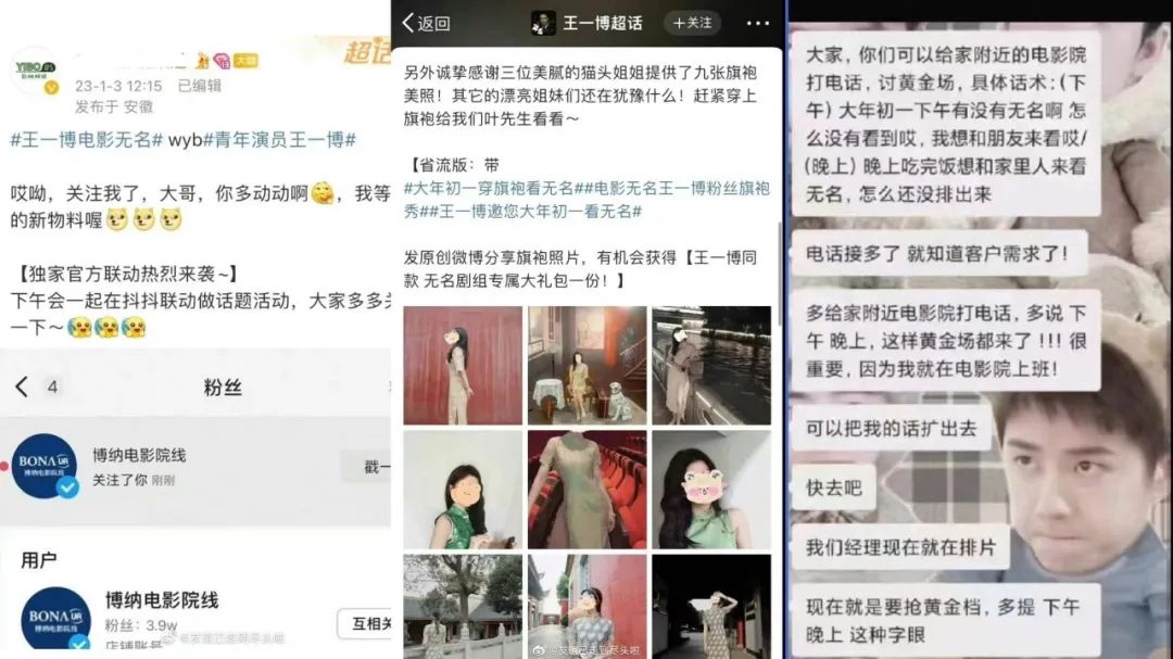 早在《無名》還沒什么官方宣發(fā)動(dòng)作的時(shí)候,王一博粉絲大號(hào)就已經(jīng)在發(fā)起“穿旗袍看《無名》”的營銷活動(dòng),試圖吸引男性單身狗去看《無名》脫單。