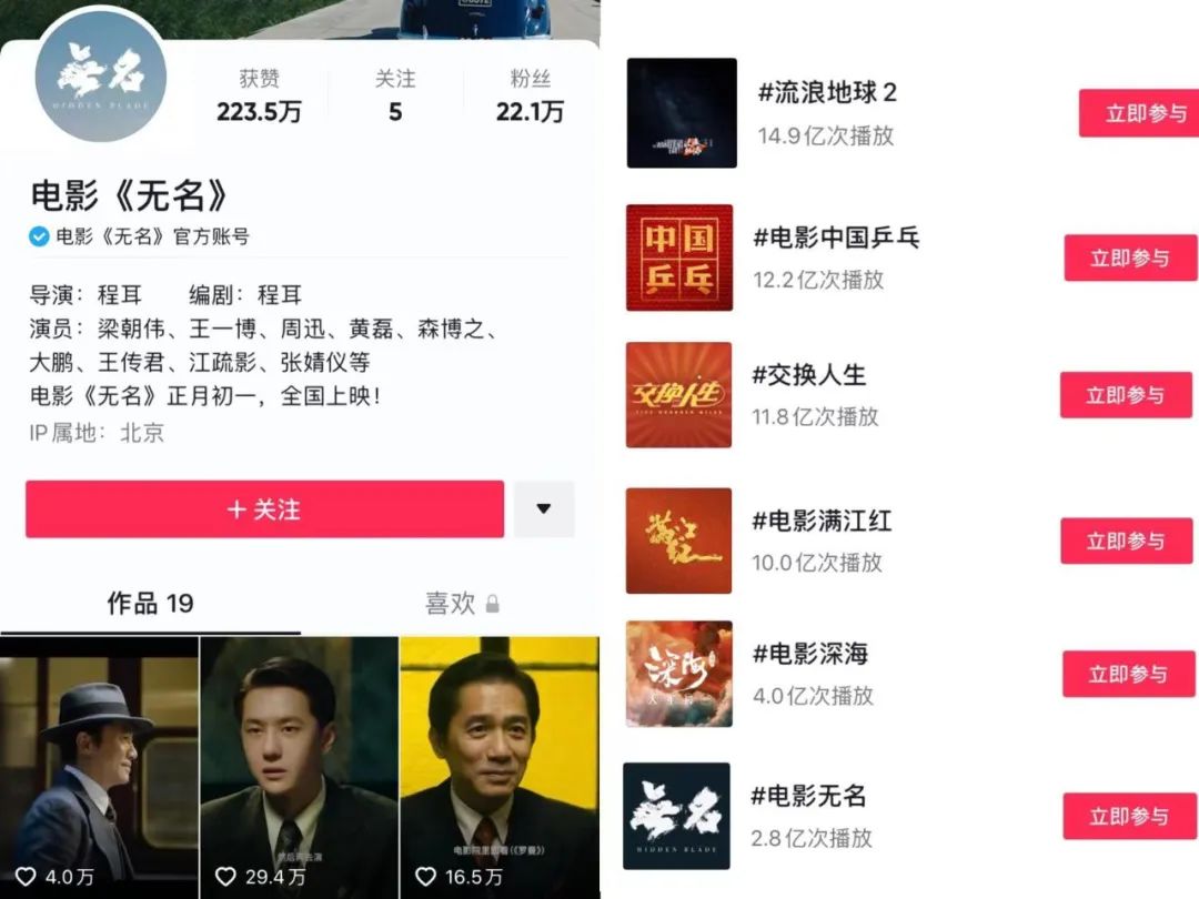 就單說一點(diǎn),《無名》在所有春節(jié)檔影片中,短視頻的宣發(fā)數(shù)據(jù)是墊底的。官抖僅發(fā)布了19個(gè)作品,電影詞條的播放量?jī)H有2.8億——連《深海》都有4億,其他電影都是10億以上。即使現(xiàn)在確定要征戰(zhàn)春節(jié)檔了,《無名》的短視頻宣發(fā)也并沒有給人奮起直追的感覺。
