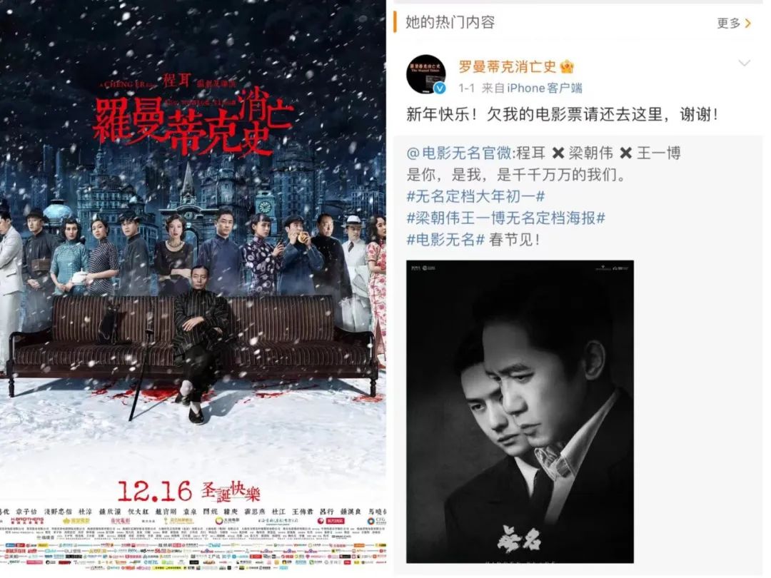 導(dǎo)演程耳此前備受好評(píng)的電影《羅曼蒂克消亡史》,本質(zhì)上是一部有觀影門檻的文青電影。這一次,片方還讓兩部電影做了聯(lián)動(dòng),《羅曼蒂克消亡史》微博還轉(zhuǎn)發(fā)了《無名》宣傳物料,并稱欠程耳導(dǎo)演電影票的去看《無名》,這能號(hào)召的電影圈層實(shí)在非常有限。而如果《無名》還是按照程耳導(dǎo)演《羅曼蒂克消亡史》的風(fēng)格,顯然不是大眾觀影的取向。