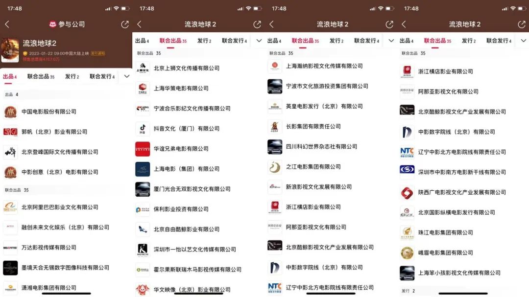 單從它背后多達(dá)39家的出品方,就能看出各方資本都很看好這項(xiàng)目。業(yè)內(nèi)頭部公司幾乎都入局了《流浪地球2》,比如阿里、融創(chuàng)、萬達(dá)、華策、抖音、華誼、上影、英皇、新浪等等。而現(xiàn)在預(yù)售第一的《無名》背后僅有11家出品方,第二《滿江紅》背后也只有21家。