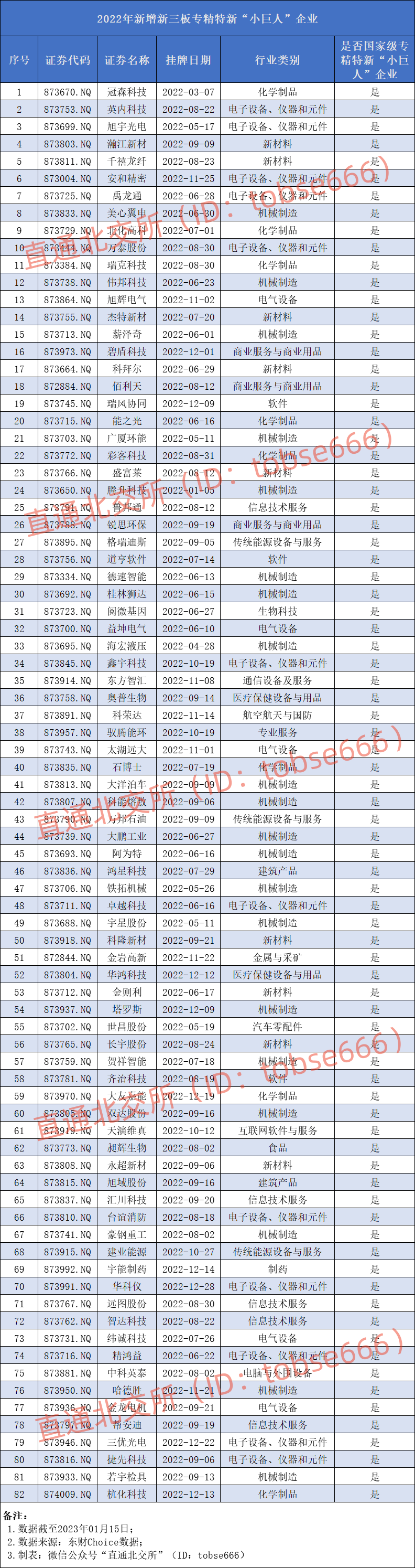 直通北交所(ID:tobse666)梳理發(fā)現(xiàn),6581家新三板掛牌企業(yè)中,國(guó)家級(jí)專精特新“小巨人”企業(yè)達(dá)到707家。2022年新增的270家掛牌企業(yè)中,有63家屬于省級(jí)“專精特新”企業(yè),占比23.3%;有82家屬于國(guó)家級(jí)專精特新“小巨人”企業(yè),占比30.4%。