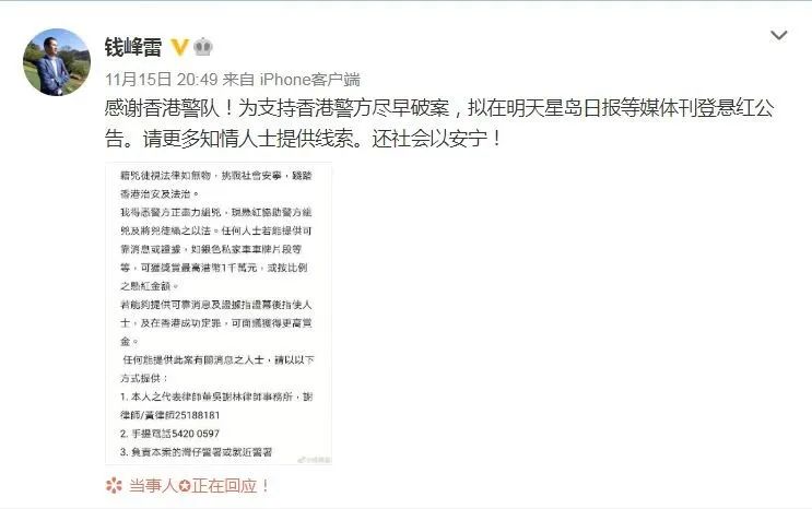 好巧不巧,江湖人稱“錢多多”的浙江富豪錢峰雷也曾遭仇敵當(dāng)街砍傷,而他早年曾在澳門永利開設(shè)環(huán)球貴賓廳。因為賭場恩怨,還在2014年11月14日,在浙江溫州市文成縣的龍尾山頂差點被活埋。6年后的同一天,又被仇敵派人砍傷,隨后錢峰雷發(fā)微博懸賞1000萬請知情人士提供線索。