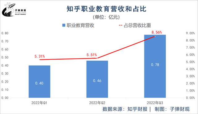 最新財報顯示,2022年第三季度知乎職業(yè)教育業(yè)務(wù)貢獻(xiàn)了0.78億元營收,營收占比雖說較之前有所提升,但尚不足10%。