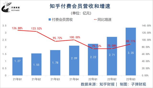 再則,知乎的付費(fèi)會員營收增速呈總體趨緩之勢。財報顯示,在過去的7個財季(2021年Q1-2022年Q3)里,知乎的付費(fèi)會員營收增速分別為126.88%、123.52%、95.72%、100.00%、75.12%、75.08%和88.11%。