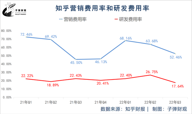 財報顯示,在過去的7個財季(2021年Q1-2022年Q3)里,知乎的營銷費(fèi)用率(營銷費(fèi)用率=營銷費(fèi)用/營收*100%)一直位于研發(fā)費(fèi)用率(研發(fā)費(fèi)用率=研發(fā)費(fèi)用/營收*100%)之上,差距最大出現(xiàn)在2021年Q2,高達(dá)50.53%;差距最小發(fā)生在2021年Q3,為23.07%。