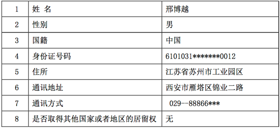 根據(jù)金花股份相關(guān)公告,邢博越出生于1996年9月,住所在江蘇省蘇州市工業(yè)園區(qū),通訊地址為西安市雁塔區(qū)。而“6101031”的身份證開頭,表明其籍貫為“陜西省西安市碑林區(qū)”。