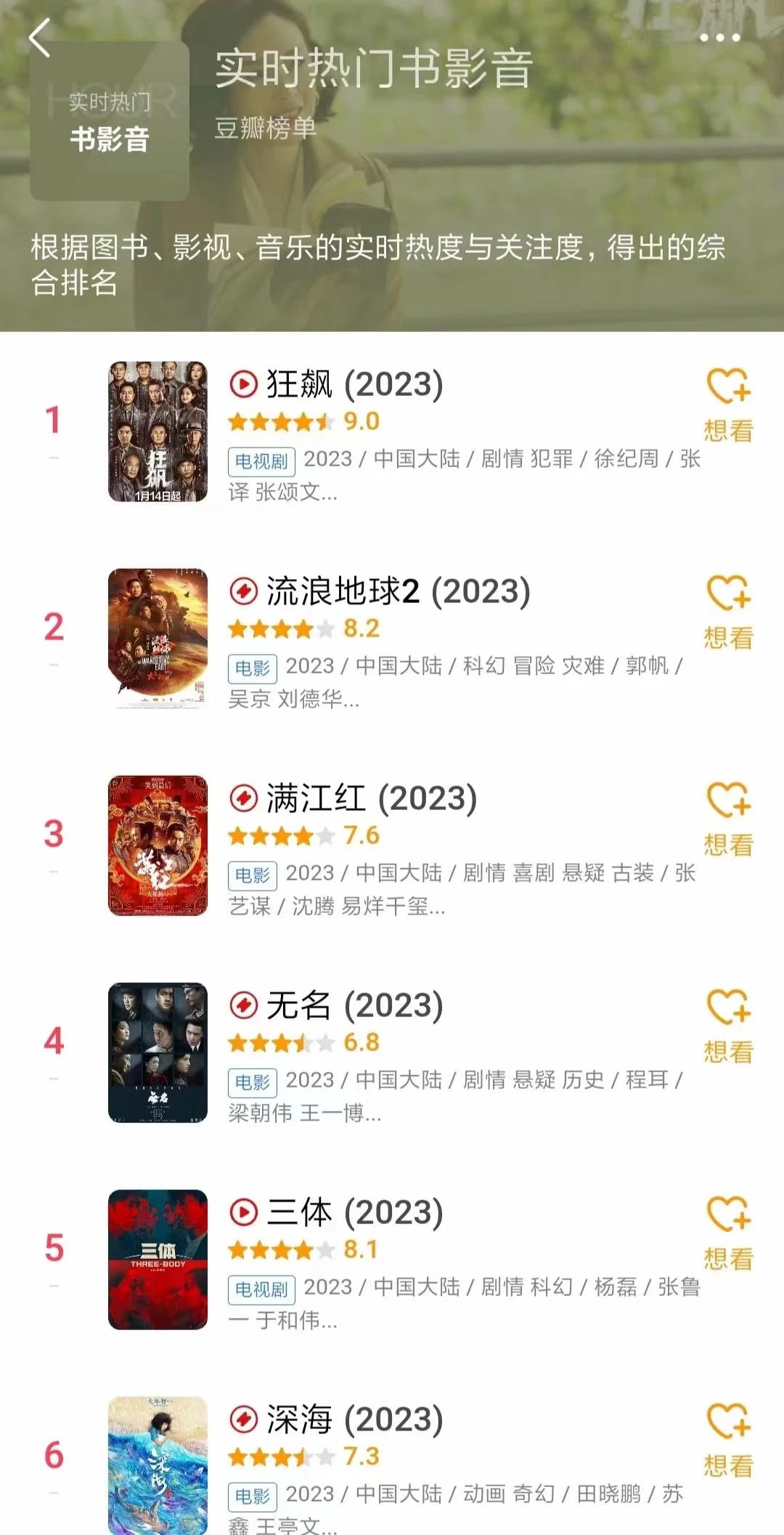 在豆瓣熱門書影音榜上,《狂飆》超越《流浪的地球2》《滿江紅》奪得冠軍,這樣的反饋側(cè)面印證了該劇成為今年國(guó)產(chǎn)劇第一部現(xiàn)象級(jí)作品的事實(shí)。
