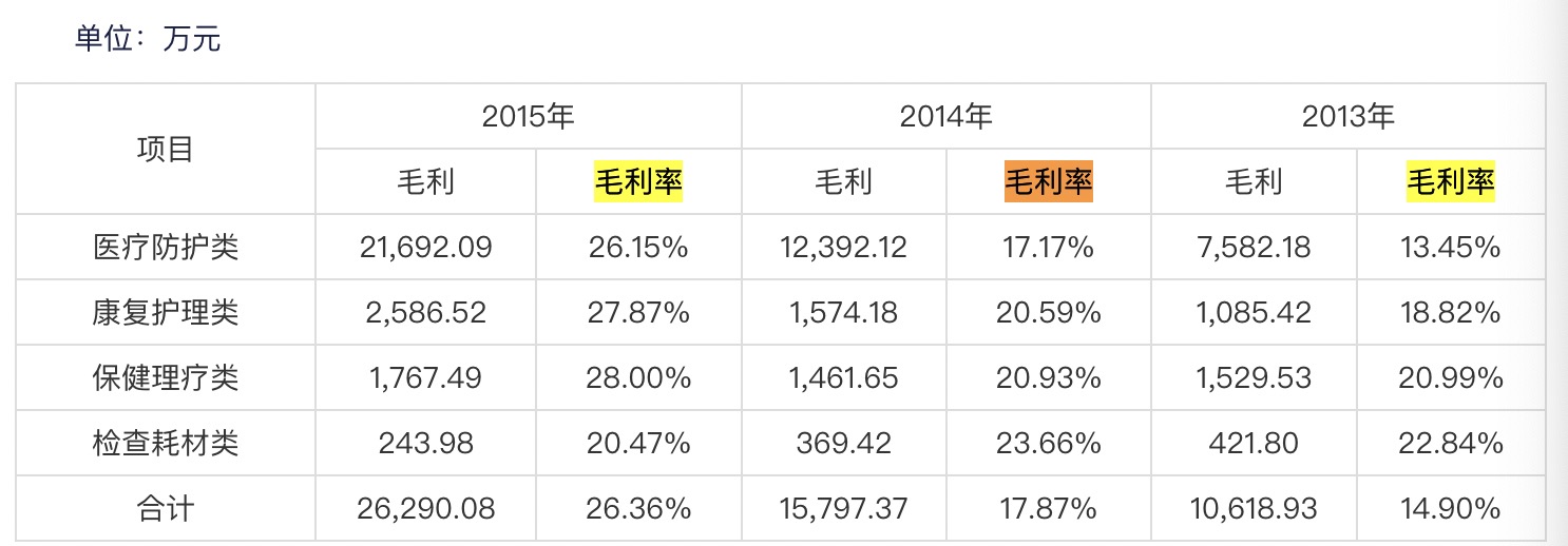 招股書顯示,2015年,英科醫(yī)療PVC手套均價(jià)為93.61元/千支;丁腈手套均價(jià)為163.97元/千支。粗略估算,PVC手套和丁腈手套共均價(jià)為128.79元/千支。2013年、2014年、2015年醫(yī)療防護(hù)類毛利率分別為13.45%、17.17%與26.15%。其中,一次性PVC手套毛利率分別為14.34%、15.99%與25.56%;一次性丁腈手套毛利率分別為16.47%、26.18%與32.31%。