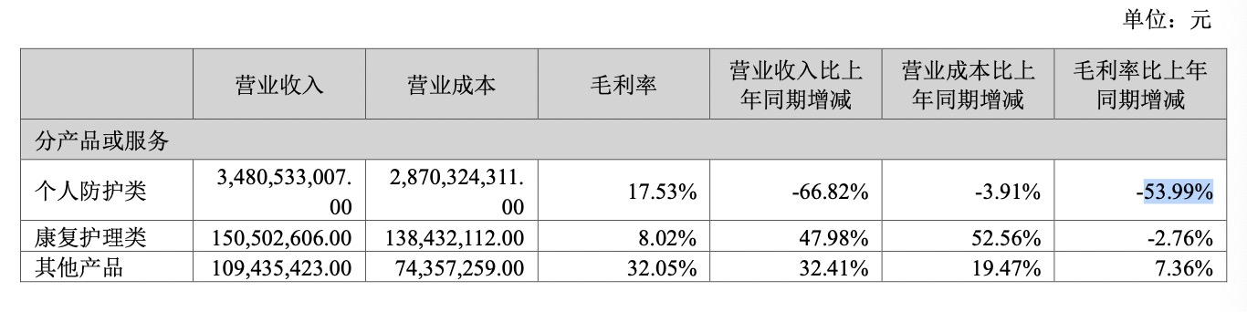據(jù)2022年半年報(bào),英科醫(yī)療個(gè)人防護(hù)類收入34.81億元,同比下降66.82%;毛利率為17.53%,同比下降53.99%。