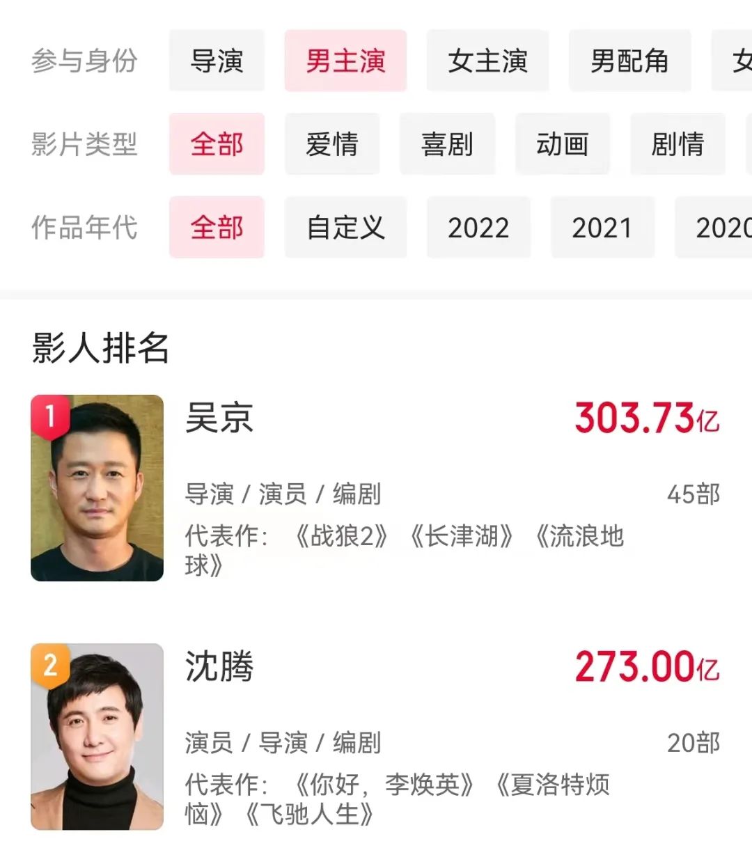 作為如今最有票房號召力的演員,只要他們出現(xiàn)在春節(jié)檔,就基本鎖定了檔期的票房冠亞軍。兩人累積的票房總數(shù),也在演員里實現(xiàn)了斷層領(lǐng)先。這個春節(jié)檔,吳京憑借《流浪地球2》,讓自己的電影總票房突破了300億,沈騰也憑借《滿江紅》突破了260億,跟第三名甩出了近100億的差距。