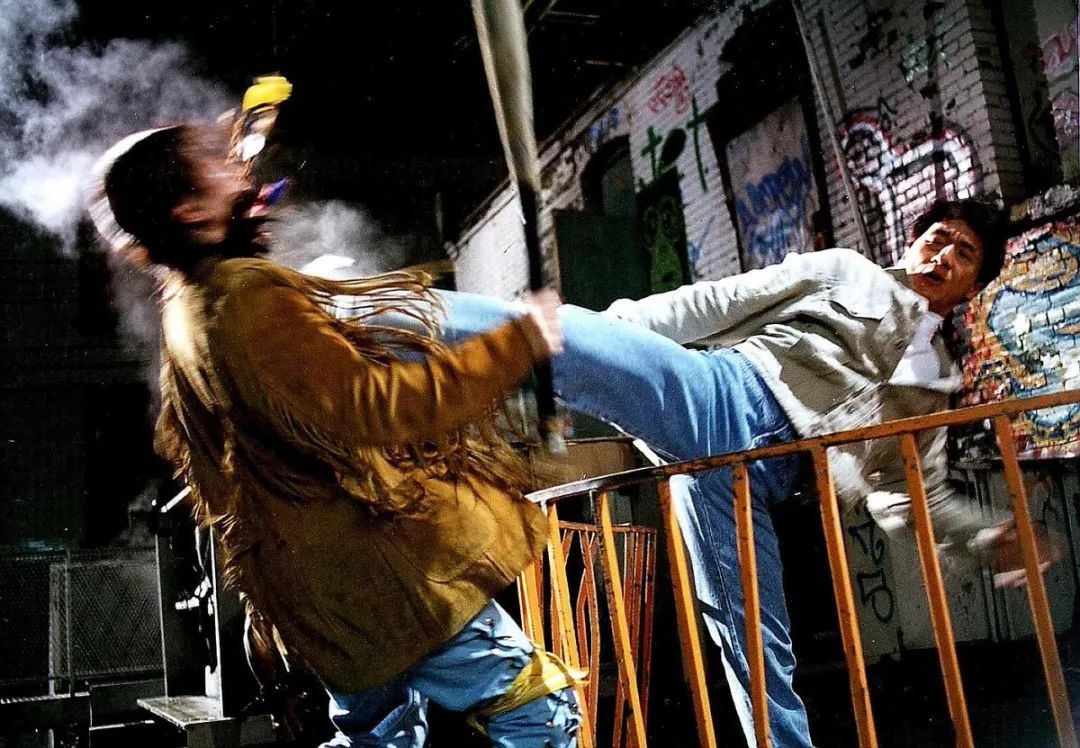 這個講述香港警察在美國紐約勇斗黑幫的故事里,成龍對著美國白人面孔喊“有種你們把槍放下”,肉搏獲勝后,成龍順便進行了一番思想教育。