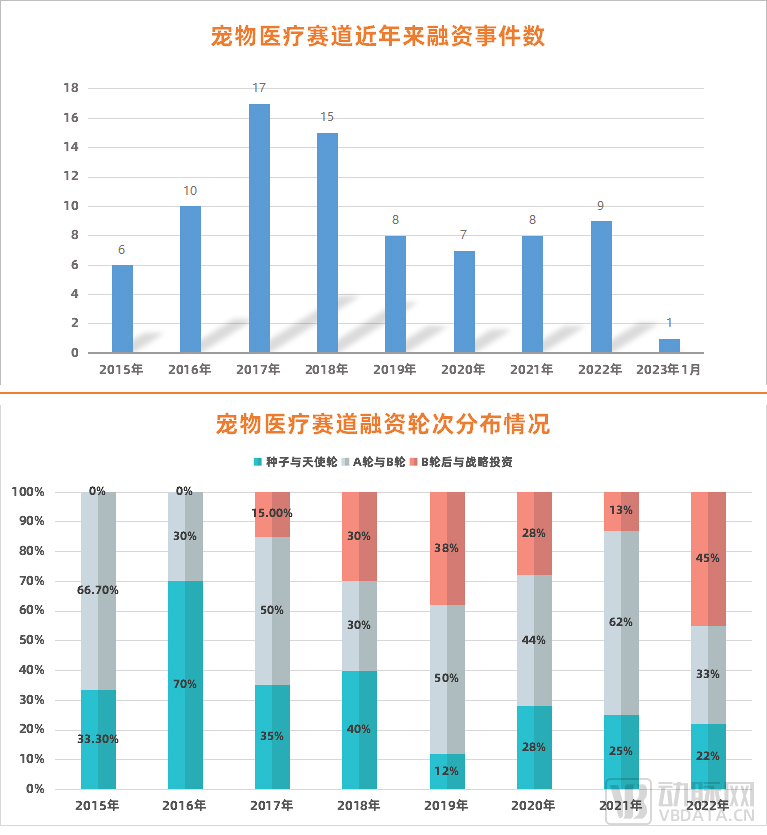 盡管從數據上看,寵物醫(yī)療賽道融資事件數自2019年起呈整體下降趨勢,但在融資的輪次占比上,早期項目逐漸減少,項目階段不斷后移。也就是說,隨著賽道頭部企業(yè)逐漸走到后期,寵物醫(yī)療行業(yè)正日趨成熟,并迎來關鍵發(fā)展節(jié)點。