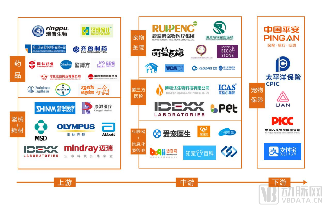 首先,寵物醫(yī)療行業(yè)的產業(yè)鏈可分為上游的藥械供應商,中游的服務提供方,以及下游的支付方。