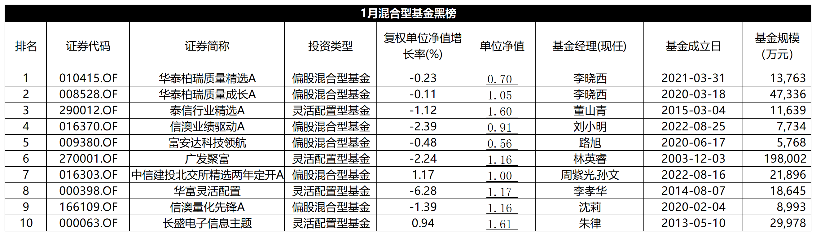 下表為綜合得分最低的10只混合型基金: