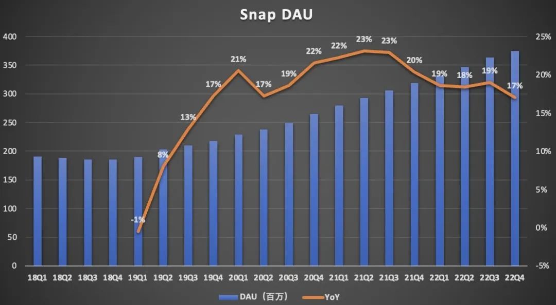 用戶是社交平臺(tái)的重要衡量指標(biāo)。Snap每日活躍用戶同比增速也在放緩。財(cái)報(bào)顯示,Snapchat第四季度日活用戶(DAU)為3.75億,同比增長(zhǎng)17%,低于上一季度19%的同比增速,以及上年同期20%的同比增速。