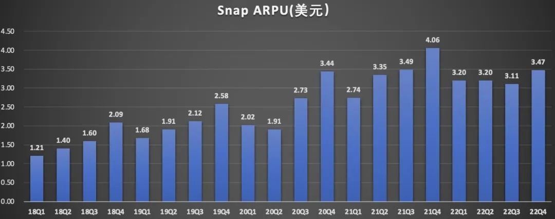 另外一個(gè)衡量平臺(tái)用戶收入的關(guān)鍵指標(biāo)是ARPU值,Snap的ARPU值已連續(xù)三個(gè)季度同比下滑。數(shù)據(jù)顯示,2022年第四季度,Snap的ARPU值為3.47美元,相比上年同期的4.06美元,下滑15%。