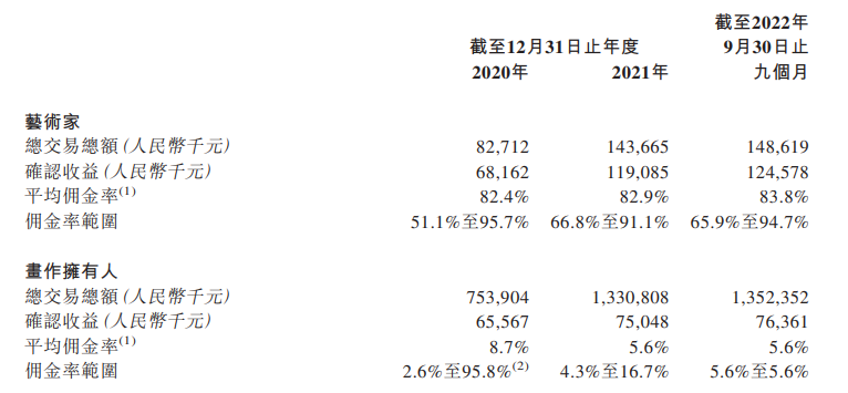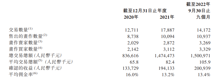 2020年、2021年與2022年前九個月,泰豐文化實現(xiàn)的藝術(shù)品交易數(shù)量分別為12711、17887、14172,總交易額分別為8.37億、14.74億、15.01億元,平均傭金率分別為16%、13.2%、13.4%。