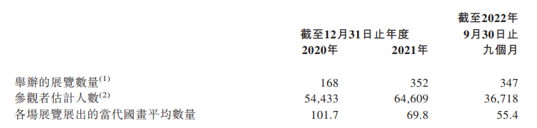 2020年、2021年與2022年前九個月,泰豐文化分別舉辦了168、352及347場展覽,其中分別有25、5及1場展覽僅線下舉辦,8、94及147場展覽僅線上舉辦,以及135、253及199場展覽線下線下同時舉辦。