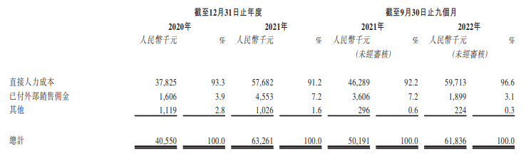 2020年、2021年與2022年前九個月,泰豐文化的銷售成本分別為4055萬、6326.1萬、6183.6萬元,其中直接人力成本(雇員獎金)分別為3782.5萬、5768.2萬、5971.3萬元。