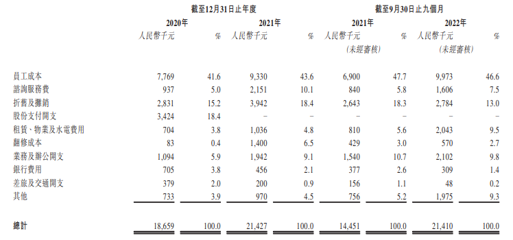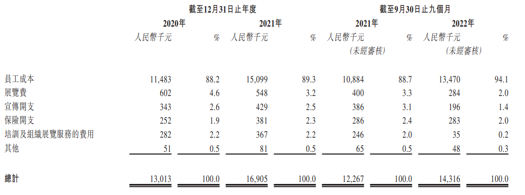 2020年、2021年與2022年前九個月,泰豐文化銷售及營銷開支部分中的員工成本,分別為1148.3萬、1509.9萬、1347萬元,展覽費分別為60.2萬、54.8萬、28.4萬元。