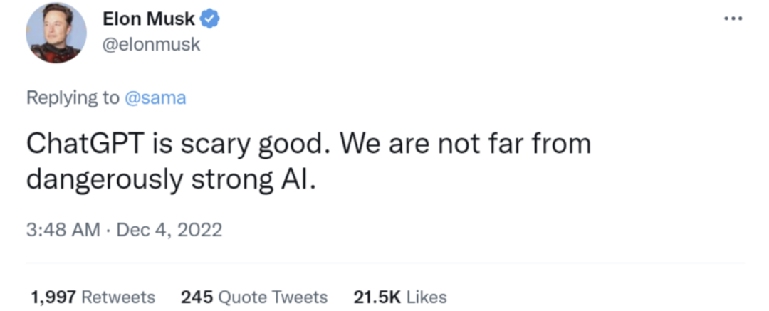 ChatGPT推出的那一天,Twitter上有個叫josh的用戶馬上就說:“谷歌完蛋了?!瘪R斯克也在幾天后發(fā)推稱,ChatGPT好的驚人,我們離強(qiáng)的可怕的AI不遠(yuǎn)了。
