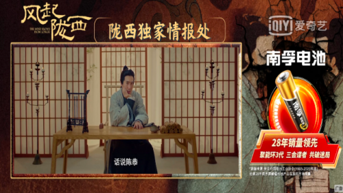 比如《風(fēng)起隴西》在商業(yè)廣告上的創(chuàng)新,結(jié)合“古裝諜戰(zhàn)劇”的定位,首創(chuàng)“片尾書(shū)場(chǎng)”模式,在片尾設(shè)置了“隴西獨(dú)家情報(bào)處”,滿足了用戶窺探情報(bào)的觀劇心理,也讓品牌南孚電池與書(shū)場(chǎng)同框,幫助觀眾復(fù)盤(pán)劇情,戲說(shuō)“棋局”。