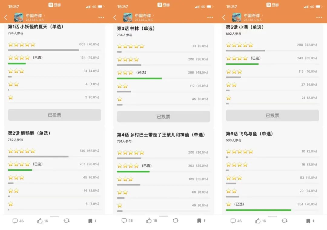 由于前兩集之后口碑開始出現(xiàn)分化,豆瓣《中國奇譚》小組不斷有人建議不同單集分開打分。很快就有組員發(fā)起分集評分投票,雖然目前只有700多人參與,但足以反映出追番粉絲們的鮮明好惡。第一、第二集分別有76%、65%的人給出了五星,第三集《林林》則有50%的人打了三星,第四集《鄉(xiāng)村巴士帶走了王孩兒和神仙》有40%給出了三星以下評分,第五集《小滿》口碑回升,四星五星占到了77%,第六集《飛鳥與魚》則是斷崖式崩塌,70%的人給出了一星。