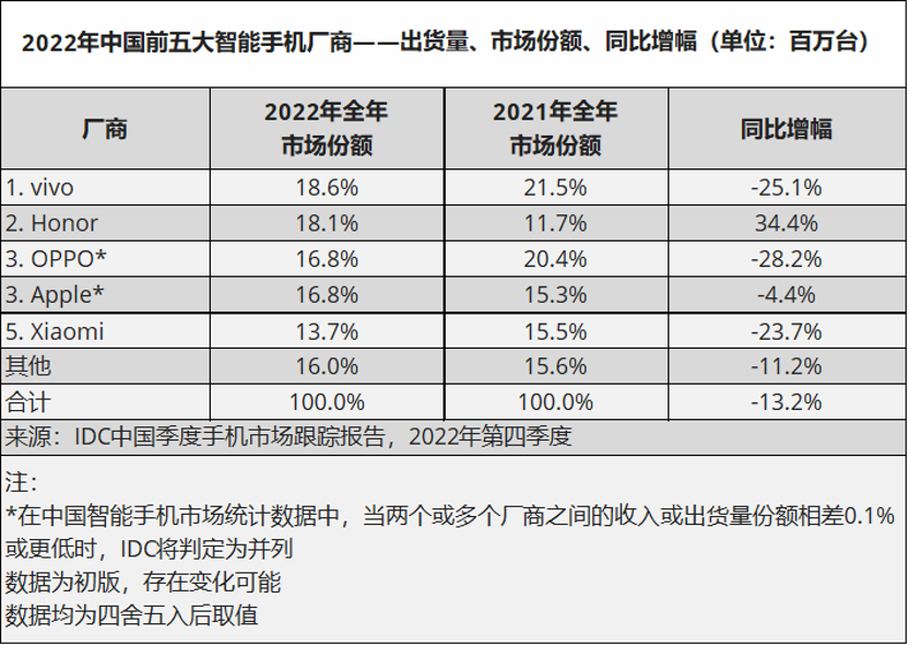 “全球智能手機的出貨量已下滑至10年來最低的水平”。IDC數(shù)據(jù)顯示,2022年,無論中國市場還是全球市場,智能手機市場都在萎縮,出貨量的跌幅為史上之最。中國市場上,小米、OPPO、vivo等手機廠商的出貨量都大幅下跌。IDC稱,出貨量下降原因在于消費者需求大幅下降、通貨膨脹和宏觀經(jīng)濟的不確定性。