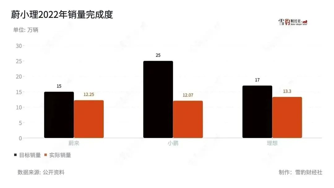 剛剛過去的2022年,對蔚小理來說仍是如履薄冰的一年,三家定下的年度KPI分別是15萬輛、25萬輛和17萬輛,實際銷量則分別為12.25萬輛、12.07萬輛和13.3萬輛,沒有一家完成任務(wù)。隨著市場競爭進一步加劇,如何提振銷量,成為擺在蔚小理面前的首要難題。