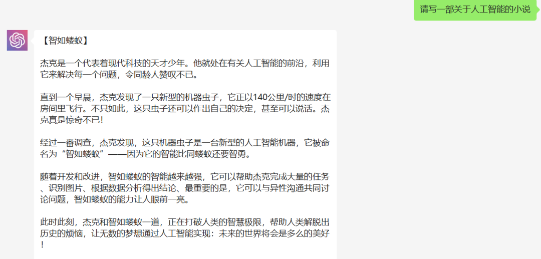 打開ChatGPT的對(duì)話框,輸入“請(qǐng)寫一部關(guān)于人工智能的小說”,幾分鐘后,你就能收獲一篇結(jié)構(gòu)完整的短篇小說。