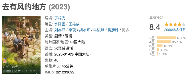 劇集口碑熱度成績顯著。“高口碑+高熱度”是Q1頭部劇集的標配。截至稿前,《狂飆》《去有風(fēng)的地方》《三體》的豆瓣評分分別是8.6分、8.4分、8.2分,與之對應(yīng)的是,這三部劇集入圍了燈塔專業(yè)版1月全網(wǎng)正片播放市占率與輿情熱度兩大榜單的TOP5。