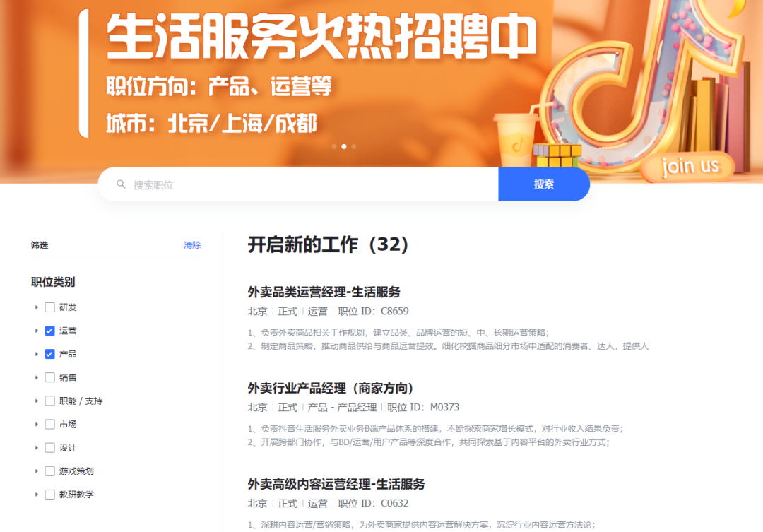 此外,字節(jié)跳動招聘官網(wǎng),現(xiàn)已掛出了外賣品類運營經(jīng)理、外賣行業(yè)產(chǎn)品經(jīng)理、外賣高級內(nèi)容運營經(jīng)理等相關(guān)職位。