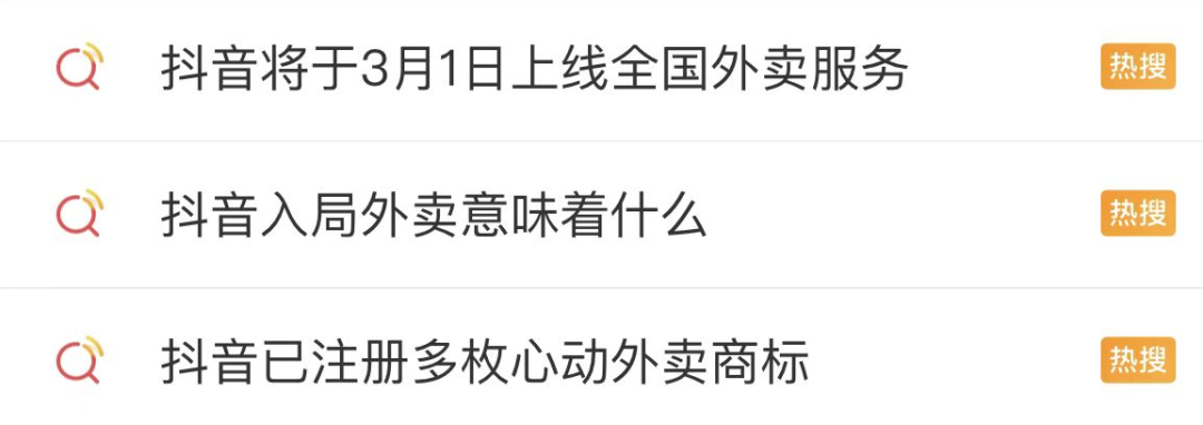 “抖音將于3月1日上線全國外賣服務(wù)”、“抖音外賣入局意味著什么”、“抖音已注冊多枚心動外賣商標(biāo)”等詞條迅速登上微博熱搜,累計獲得了12億+的閱讀量。