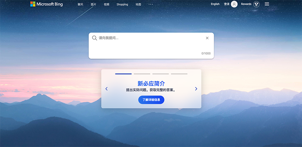 新版Bing主頁有很多微妙的變化,首先是搜索框變大了,可以輸入多達1000個字符的查詢。
