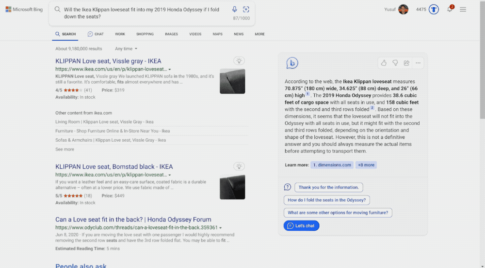 再比如搜索“宜家Klippan坐墊是否能放到我的2019款本田奧德賽汽車座位上”,Bing會找到沙發(fā)尺寸與汽車內(nèi)部空間尺寸的信息,來估算這種搭配是否合適。