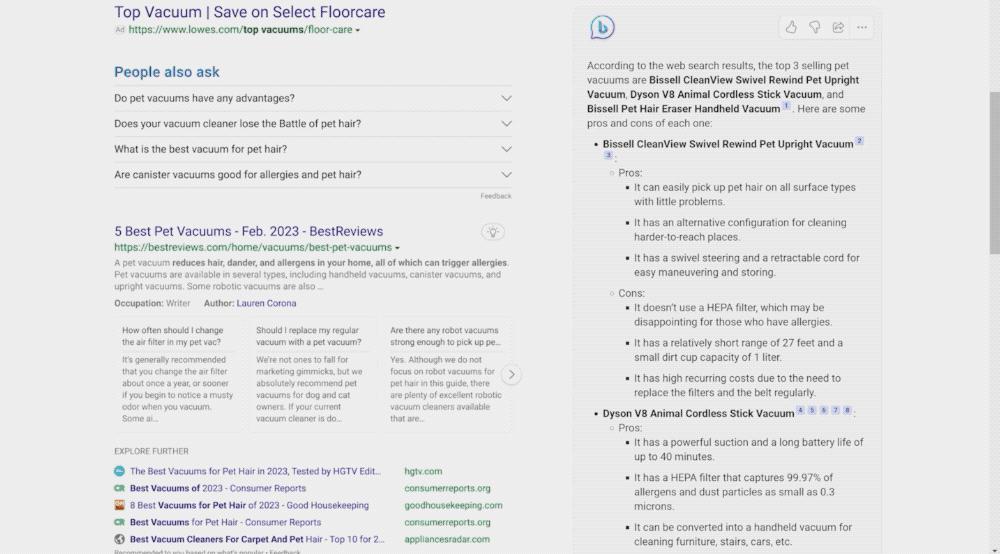 當你買東西時,你可以讓Bing搜索、尋找、比較銷量最高的3款寵物吸塵器,并分別列出它們的優(yōu)點和缺點。