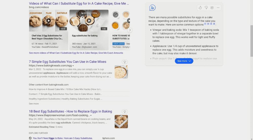 比如當你在做蛋糕時,發(fā)現(xiàn)缺少某種關(guān)鍵材料,如雞蛋,你可以在Bing上搜索雞蛋的替代品,AI不僅會一次性給出多種答案,而且還會提供估算各自具體用量有多少、可能對食物產(chǎn)生的影響。