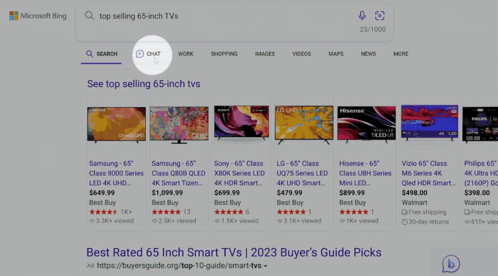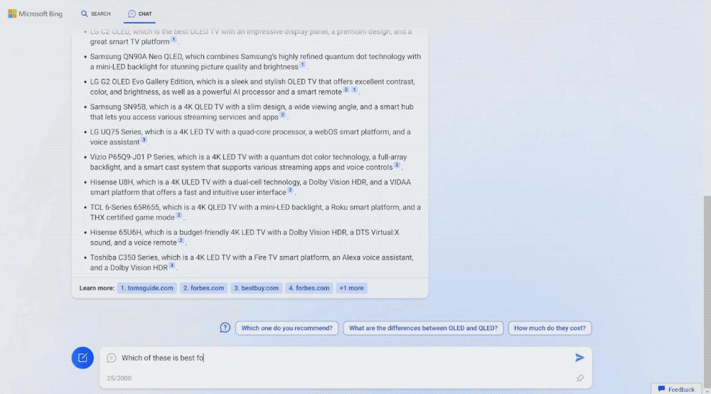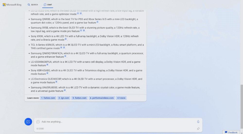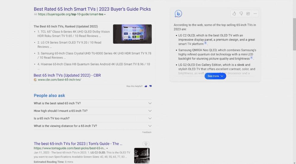 通過引入聊天功能,新版Bing變得更像個人助手。你可以讓它幫你完成旅行計劃、購物研究等等。比如當你想買一個65英寸電視,右側(cè)會一口氣列出2023年最暢銷的65英寸電視清單。