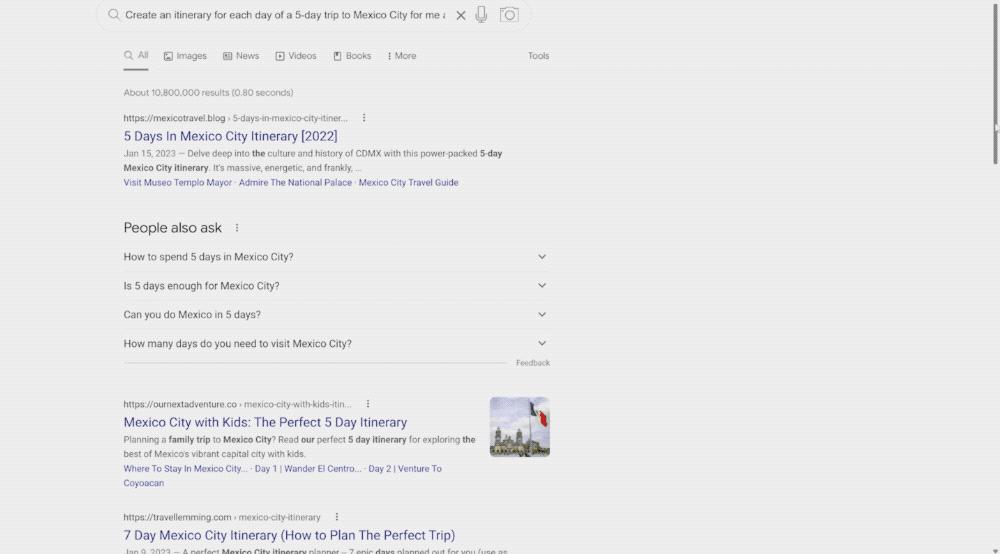 Bing還可以改變旅行計劃效率。比如在搜索框中輸入“為我和我的家人創(chuàng)建一個墨西哥城5日游計劃,傳統(tǒng)搜索方式查詢起來還是挺花時間的。