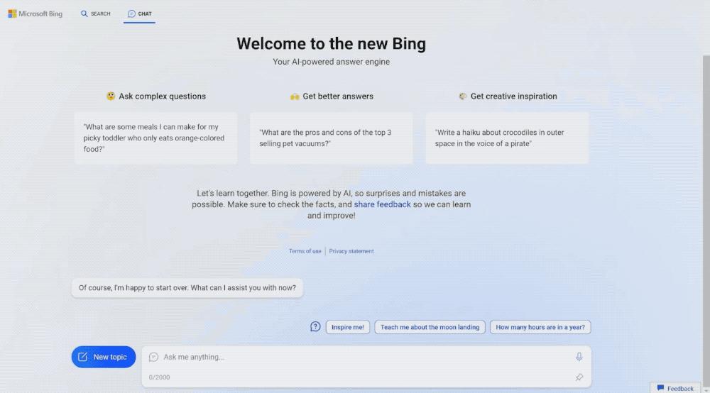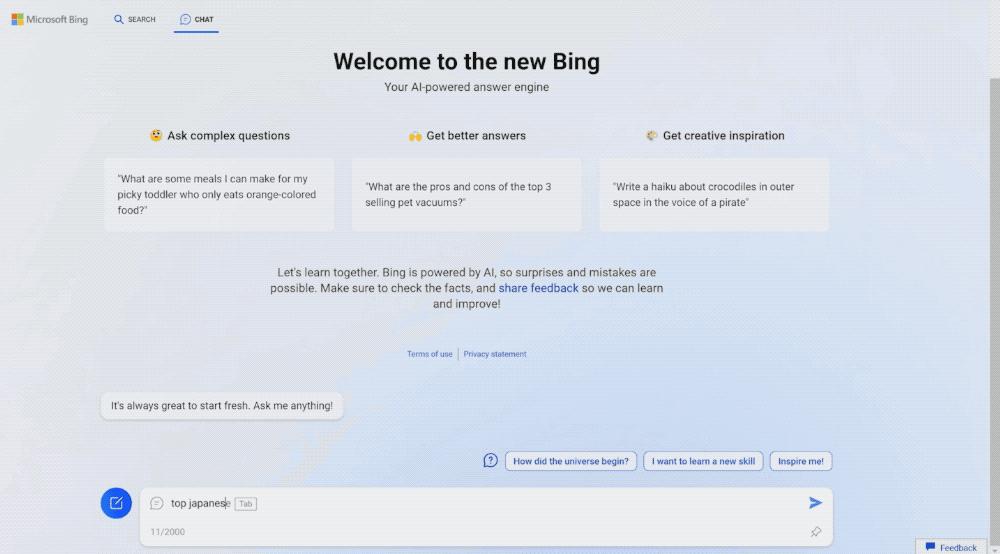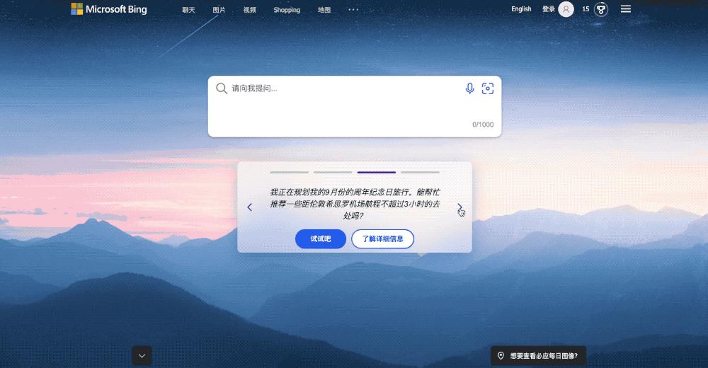 你可以在消息框中最多輸入2000個字符,提出完整的問題,與Bing自然地交流,了解更多你想知道的信息。
