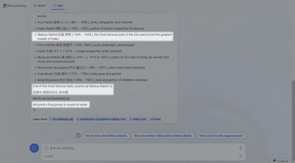 你還可以跟Bing聊聊文化和藝術(shù)。比如輸入“頂級日本詩人”,Bing會給出一個名單,里面包括日語和英語的組合。