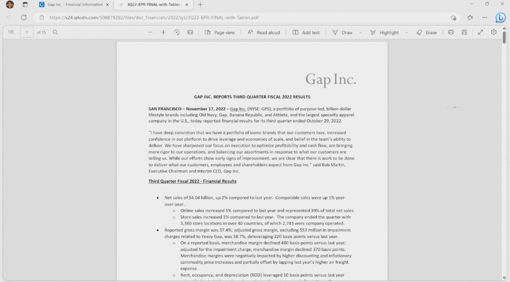 比如在Gap網(wǎng)站上,你想看最新季度財報,但是15頁PDF文件的信息也太多了。這個時候,你就可以點開右上角的藍色“b”圖標,打開右側(cè)的菜單欄,在“Chat”功能頁面輸入“從頁面內(nèi)容劃重點”,它會自動輸出提煉好的重點信息。