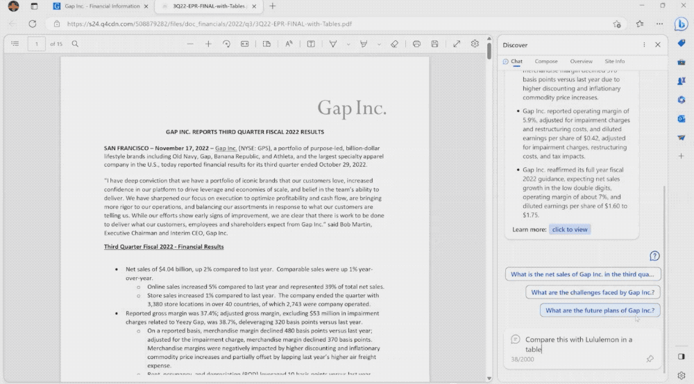 你還可以要求它把Gap的這份季度財報跟Lululemon第三季度財報做對比。它會從網(wǎng)上自動收集Lululemon的財報信息,然后放到Edge中,為你呈現(xiàn)一個清晰直觀的圖表對比。